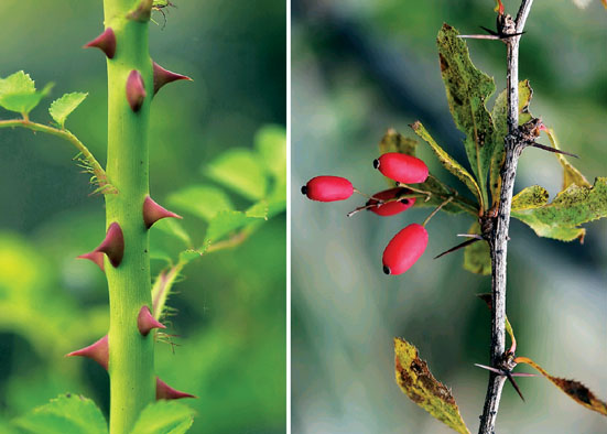 ▲찔레(사진 왼쪽)의 피침과 섬매발톱나무의 엽침. 종의 유지를 위해 방어수단으로 진화. 경침 등 다양… 다가오지 말라는 경고 보통 식물의 가시는 끝이 날카롭게 뾰족하고 목질화 되어, 딱딱해진 것을 칭한다. 식물체의 줄기, 잎. 뿌리 등 다양한 부위에 부착되어 있고, 크기와 모양 또한 천차만별이다. 그런데 이런 식물의 가시를 기원에 따라 몇 가지로 구분할 수 있다.어떻게 나눌 수 있을까? 식물의 '가시'하면 가장 먼저 떠오르는 식물이 장미일수 있겠다.장미의 가시에는 재미있는 신화적 유래가 있다.어느 날 큐피드가 장미꽃의 아름다움에 취해 입을 맞추려는 순간 벌이 입술을 쏘아 버렸다.이에 화가 난 큐피드의 어머니 비너스는 벌들의 침을 떼어버렸고 이 침이 장미 줄기에 남겨졌는데, 이것이 장미 가시로 되었다는 것이다. 그런데 장미의 가시는 그 기원이 줄기 겉껍질이다.이러한 기원을 갖는 가시를 보통 피침(皮針)이라하며, 보통 손으로 젖히면 잘 떨어진다.찔레, 산딸기류(탈낭), 음나무(엄낭), 초피나무(제피낭) 등의 가시가 여기에 속한다. 잎과 열매가 없는 탱자나무는 가지가 온통 가시뿐인 것처럼 보인다.이처럼 가시가 줄기의 성질을 지닌 것을 경침(莖針)이라하며, 떼어내거나 부러뜨리기가 힘들다.감귤류, 주엽나무, 꾸지뽕나무, 산유자나무 등의 가시가 이에 속한다. 선인장류는 많은 가시가 돋친 대표적 식물군이다. 그런데 이들의 가시는 엄격히 말하면 잎이다.다육질의 줄기에 가시모양의 잎을 갖고 있는 셈이다.이처럼 기원이 잎인 것을 엽침(葉針)이라 한다.보통 잎 아래에 달리는 턱잎이 가시로 변한 경우도 있으며(탁엽침), 이 경우 보통 잎자루 옆에 가시가 달린다. 골담초, 섬매발톱나무, 아까시나무 등의 가시가 여기에 속한다. 이외에 뿌리의 변형인 근침(根針)이 있으며 열대의 야자나무과의 일부에서 볼 수 있다. 또한 잎의 가장자리 부분이 가시형태로 변형된 호랑가시나무, 엉겅퀴, 도깨비가지 등이 있고, 남가새, 마름, 밤나무 등의 열매에도 다양한 형태의 가시가 있다. 식물은 종의 유지와 번성을 위해 다양한 방법으로 진화해 왔다. 특히 동물 등의 가해자에게 맞서는 한 가지 방법을 터득해 냈다. 바로 '가시'다. 식물의 가시는 생존을 위한 하나의 전략으로 자신에게 다가오지 말라는 경고의 메시지를 보내고 있는 것이다.