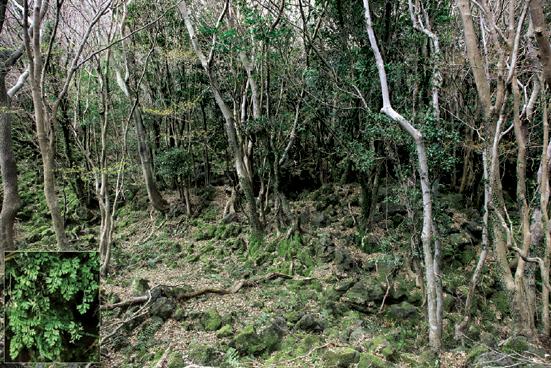 ▲곶자왈에는 약 612 종류의 식물이 자라는 것으로 알려져 있다. 작은 사진은 좀고사리. 이제는 뭍사람들에게 조차 곶자왈 숲은 제주를 대표하는 이미지가 되었다.때 묻지 않아 청정하고, 다양한 생물종이 어우러져 살며, 숨 쉬고 있는 원시림으로 여겨지고 있는 것이다. 그럼 이곳에는 어떤 식물들이 얼마나 자라고 있을까? 최근 연구에 따르면 제주 곶자왈에는 약 612 종류의 식물이 자라는 것으로 알려져 있다.이러한 점은 곶자왈에 제주 전체 분포식물의 약 32% 정도가 분포하는 것으로, 곶자왈이 제주도 면적의 약 6%인 점을 감안한다면 실로 경이로운 수치이다. 어떻게 이렇게 좁은 면적에 이 많은 식물군이 분포할 수 있을까? 이것은 '곶자왈 속에 작은 한라산이 있다'라는 말로 설명이 가능하다.다시 말하면 곶자왈은 화산섬에서 나타나는 매우 독특한 지질, 지형적인 특성과 지리적 입지를 갖고 있다. 이로 인해 나타나는 미세기후 및 환경이 한라산 저지대에서 고지대에 이르는 생육환경과 상응하고 있어, 다양한 기후대의 식물들이 분포할 수 있는 것이다. 하나의 예로 좀고사리는 한라산의 약 1000m 이상 되는 습한 계곡부 등에서 주로 자라는 식물이다.그러나 곶자왈 지역에서는 400m도 안되는 습한 바위 등에서 관찰된다. 한라산식물 수직분포의 개념을 무색하게 하는 현상이다.게박쥐나물, 한라돌쩌귀 등도 그러하다. 이러한 사례는 내륙의 풍혈지 등에서 일부 보고되고 있으나, 이처럼 광범위한 면적에서 이런 독특한 식물상과 식생이 나타는 경우는 매우 드물다. 이러한 면은 학술적인 측면에서도 가치가 매우 높게 평가되고 있다. '제주의 허파', '제주 생태계의 생명선', '살아 숨 쉬는 땅', '제주도의 숨골', '제주의 아마존' 이 모두가 제주의 곶자왈을 칭하는 말들이다.'제주도의 아마존'인 곶자왈 숲은 지난 10년간 약 10%가 대규모개발사업과 도로개설 등으로 없어지거나 훼손 되었다고 한다. 그러나 지금도 개발은 계속되고 있다. 지금 멈추지 않으면 '곶자왈의 눈물'을 볼 날이 머지않은 듯하다.
